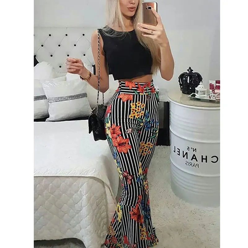Best Women 2021 Fashion Two Piece Set Sleeveless Crop Vest Tops + Floral Long Flare Pants Trousers Female Clothing and You will save 49% or US $22.43 today